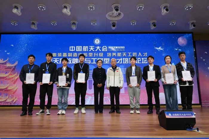 “五一”劳动节前夕,在武汉召开的中国航天大会“全国职业院校科普卫星研制工程邀请赛”颁奖仪式上,中国职业技术教育学会会长、教育部原副部长鲁昕为技师学院获奖选手代表邱世龙颁奖,并与中国运载火箭技术研究院龙乐豪院士一同和获奖选手合影留念。