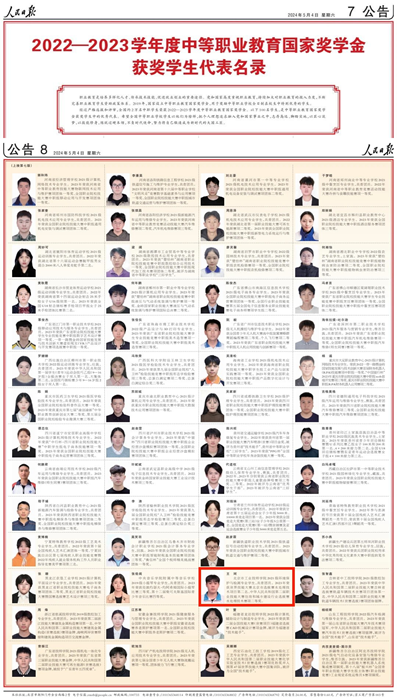 5月4日、5日,《人民日报》专版刊登了100名研究生国家奖学金获奖学生优秀代表、100名本专科生国家奖学金获奖学生优秀代表、100名中等职业教育国家奖学金获奖学生优秀代表名录。北京市工业技师学院环保与生物制药系2021级环境保护与检测专业学生王珂,榜上有名。