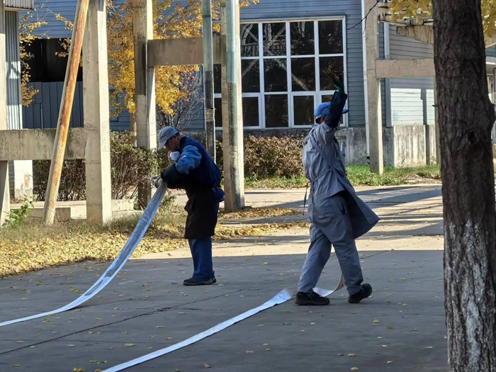 此外,在安全人员的组织下,干部职工还在消防水带演习场所,现场连接消防水带,实际演习了用消防水带灭火的过程。