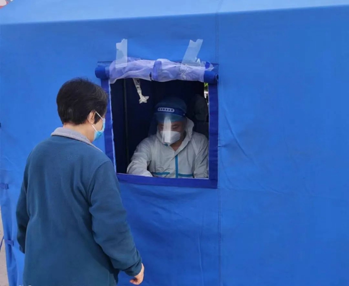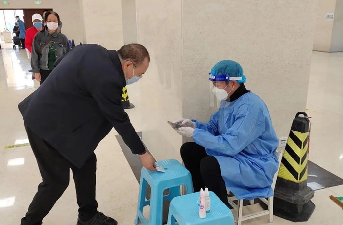 共产党员张增惠在延静里社区华商大厦检测点参加防控志愿服务。