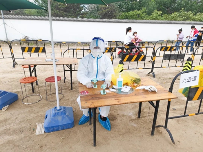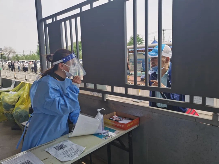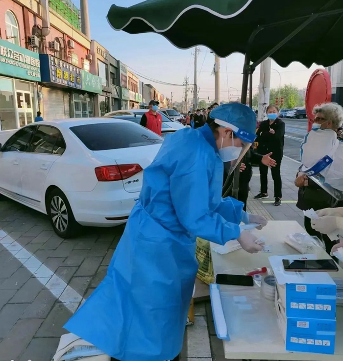 共产党员冀高娜在朝阳区兴隆社区参加核酸检测志愿服务。